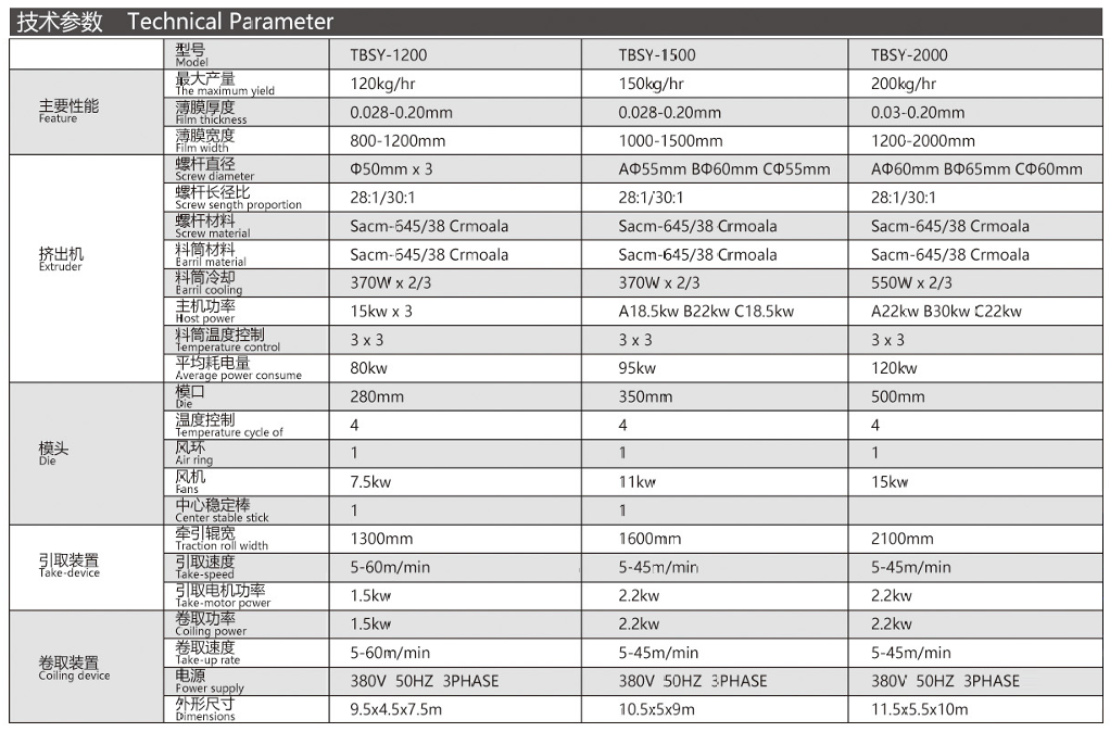 機(jī)器特性 吹制各種規(guī)格的低密度聚乙烯、高密度聚乙烯和線性低密度聚乙烯塑料薄膜,廣泛應(yīng)用于食品百貨、日用、化工 針紡品、購(gòu)物禮袋和工業(yè)包裝。機(jī)筒、螺桿采用38CrMOAI合金材料經(jīng)氨化處理精密加工而